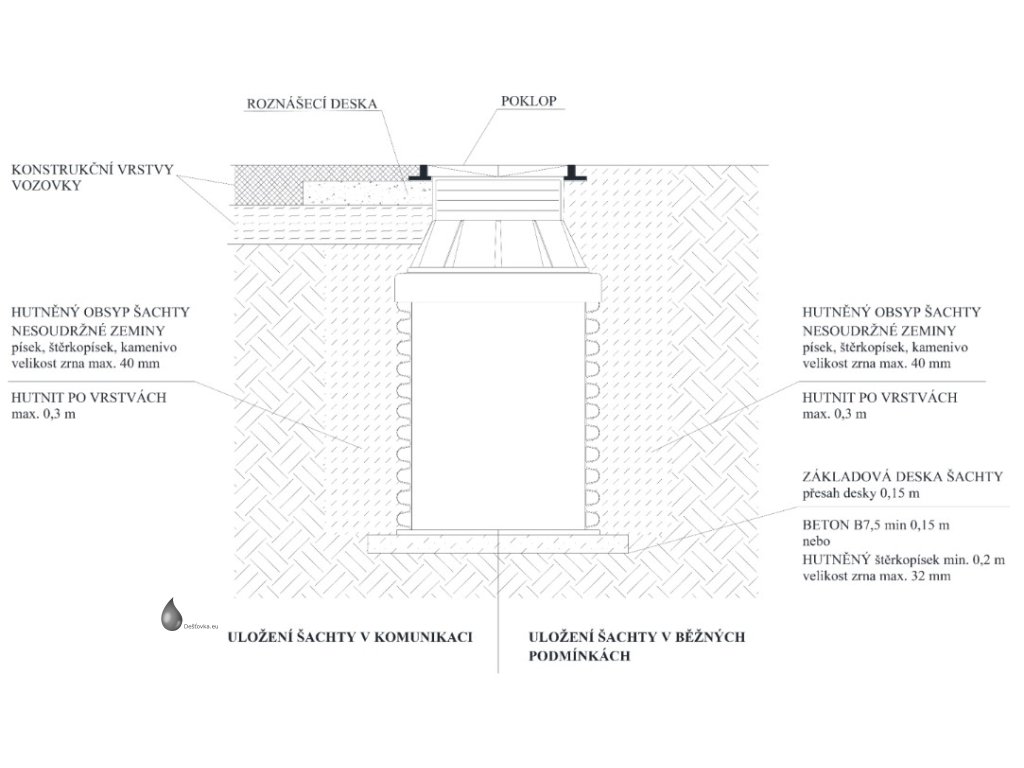 Pro zachování záruky a dlouhodobé stability jímky je bezpodmínečně nutné dodržet montážní návod. Jímka musí být usazena na vodorovnou základovou plochu (přesah min. 150 mm) vytvořenou z dobře zhutnitelné nesoudržné zeminy (např. štěrkopísek o síle min. 200 mm a míře hutnění min. 85% pgs) nebo nahrazenou monolitickou betonovou deskou o síle 150 mm. Následný obsyp se provádí po vrstvách maximálně 300 mm a pouze nesoudržnými zeminami (štěrk, štěrkopísek, drcené kamenivo 8/16), které neobsahují částice větší než 35 mm. Je třeba se vyhnout používání hlinitých a jílovitých zemin, jelikož nedostatečné hutnění nebo nevhodný obsyp vede k riziku deformace pláště šachty. Při osazení v místech s předpokládaným zatížením (např. dopravou) je bezpodmínečně nutné nad šachtou osadit roznášecí betonovou desku.