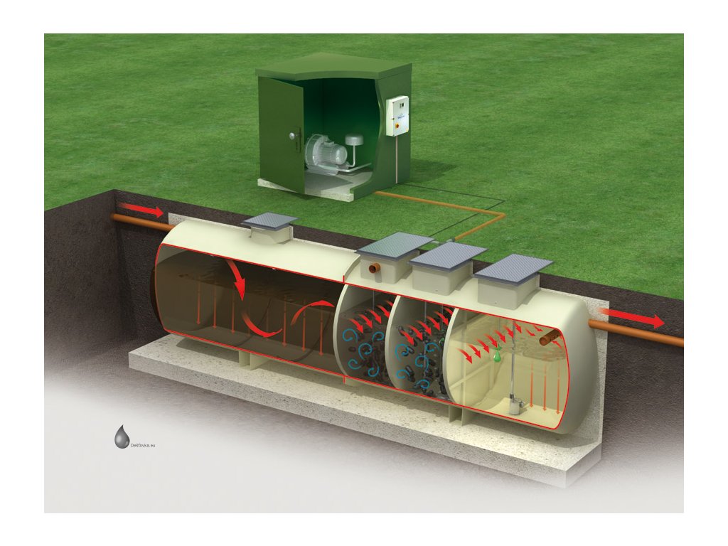 Dmychadlo se nachází externě ve skříňce mimo nádrž. Skříňka a propojovací materiál je součástí dodávky. Základní typ je osazen gravitačním výtokem přečištěné vody, je však možné ČOV osadit také čerpadlem pro přečerpávání přečištěné vody dle potřeby.