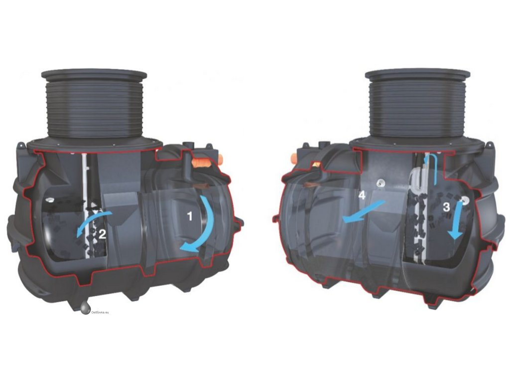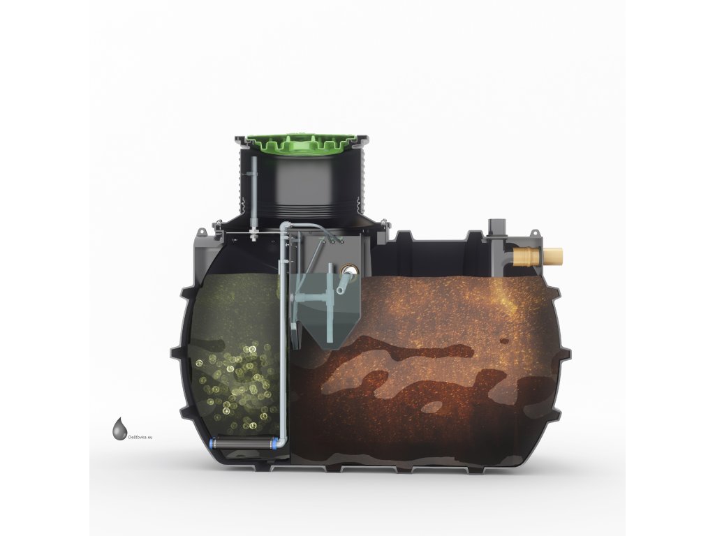 Vyčištěná kapalina protéká gravitačně do další komory, ve které je umístěno vysoce výkonné plovákové čerpadlo. Po dosažení určité hladiny odčerpá kapalinu pod tlakem.