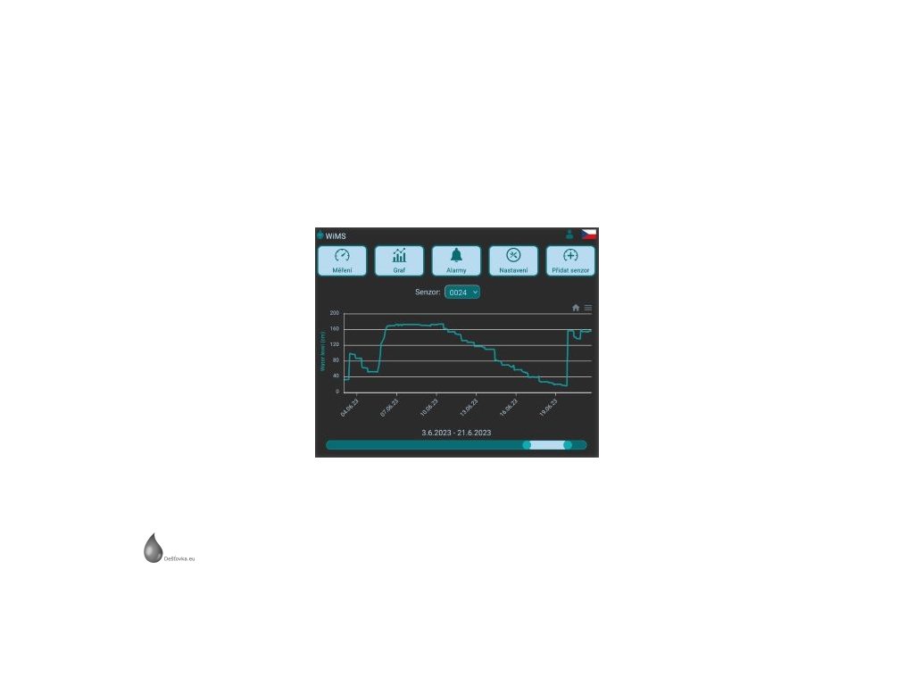 WiMS-US20 je univerzální bezdrátový monitorovací systém k měření hladiny vody ve větších cisternách, nádržích, žumpách nebo vodních tocích bez nutnosti předchozích stavebních úprav. Pro přenos dat je použita technologie WiFi, která slouží pro připojení elektronických zařízení k síti Internet. Měřené údaje se ukládají na server a pomocí webové aplikace lze sledovat aktuální úroveň hladiny nebo zobrazit změřené hodnoty za zvolené období. Systém umožňuje vysílat alarmová hlášení na zadanou emailovou adresu nebo pomocí SMS při poklesu hladiny pod stanovenou mez nebo při překročení nastaveného limitu okamžitě po změření. Integrovaná baterie zajistí trvalý provoz po dobu minimálně dvou let při nejkratším nastaveném intervalu odesílání dat 1 hodina a měření alarmových stavů po 15 minutách.