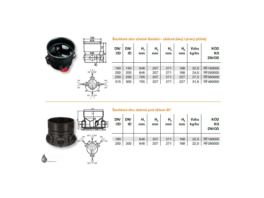 - DN 600/160 úhel 45° (průměr horního hrdla/průměr vstupů a výstupů a úhel, který otvory svírají vůči sobě)