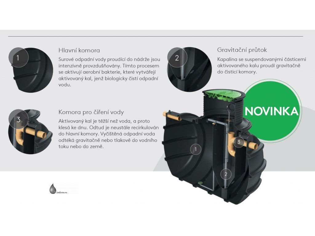 Systém čistírny spočívá v jednoduchosti a kompaktnosti. Veškerá technologie potřebná k chodu čistírny - dmychadlo, potrubí, ventily je umístěna v nádrži a jejím nástavci, pod poklopem. K čistírně není potřeba dokupovat žádné další komponenty. Čistírna je přednastavena již z továrny, zprovoznit ji zvládne každý dne manuálu na konci této stránky. Samotné tělo čistírny je vyráběno za pomocí litého plastu (rotomoulding) což ocení zejména lokality se zásobováním ze studní, nádrž nemá žádné sváry kudy by mohli protékat splašky, čímž nedochází ke kontaminaci okolních studní. V případě potřeby je možné výtok přečištěné vody řešit ponorným čerpadlem, zejména v lokalitách, kde nejsou vhodné spádové podmínky.