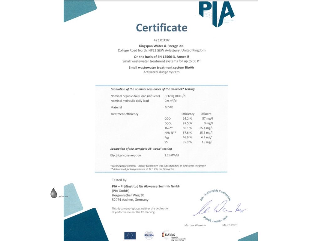 Čistírna splňuje normu: EN: 12566-3: 2005+A2:2013 - certifikát CE