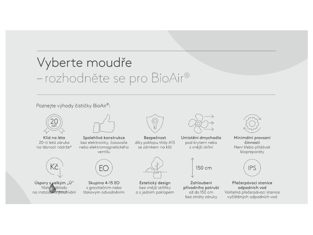 Čistírna odpadních vod Kingspan BioAir má vestavěné dmychalo přímo pod poklopem v instalační šachtě, čímž dojde k úspoře financí (není třeba zakupovat samostatnou nadzemní skříň a kabeláž k ní). Využívá provzdušňovací technologii pro zajištění vysoké úrovně kvality vypouštění vody. Nabízí flexibilní možnosti instalace, aby vyhovovaly různým místům v domácnosti. Kingspan BioAir je cenově výhodná volba pro řešení vašeho domácího čištění odpadních vod, pokud chcete čistírnu, kterou zapojíte a funguje.