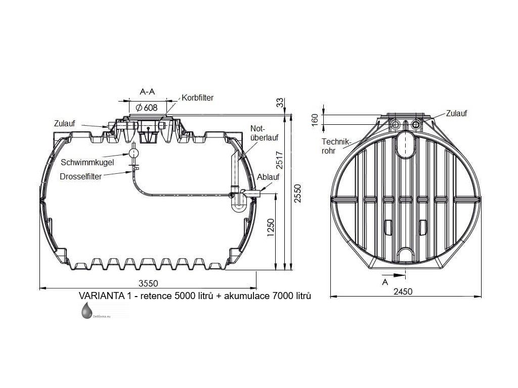- Varianta 1 - RN5000/AN7000 (retenční část objem 5000 litrů/akumulační část objem 7000 litrů)