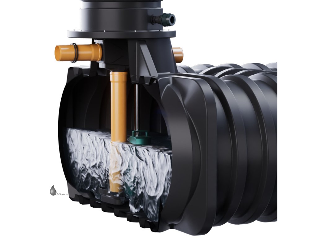 Její plochý tvar umožňuje snadnou instalaci s minimálními výkopovými pracemi, což výrazně snižuje náklady a čas potřebný k uvedení do provozu. Nádrž je vyrobena z odolného polyetylenu (PE) a je dostupná ve dvou velikostech: 3 000 a 5 000. Jedná se o označení výrobce. Objem nádrží je 2730 litrů resp. 4762 litrů a užitný objem nádrží dle standardní instalace nátoku a odtoku je 2274 litrů resp. 4364 litrů. Jímka je vyrobená metodou rotačního tváření plastů, jímky jsou z jednoho kusu. Jímky jsou 100 % vodotěsné a bezešvé. Žádné lepení ani svařování. Nádrž je vhodná pro dotaci Dešťovka.