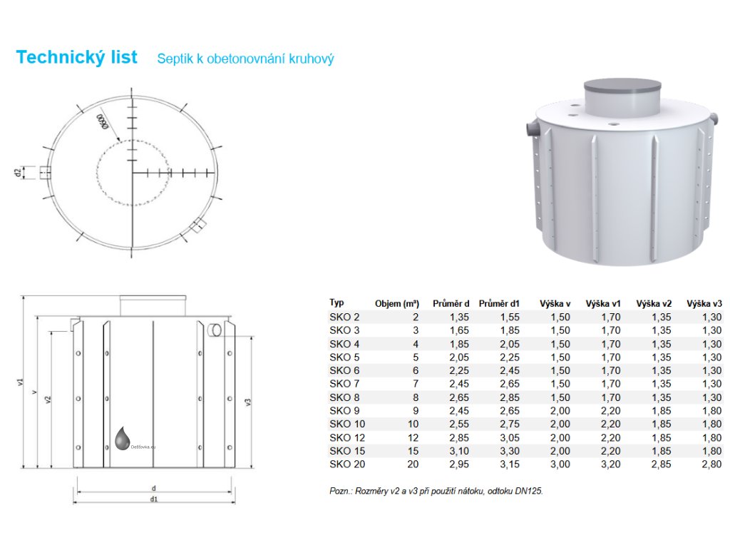 - Objem: 3000 l (3,0 m3) / Průměr vnitřní: 1650 mm / Průměr vnější: 1850 mm / Výška: 1500 mm