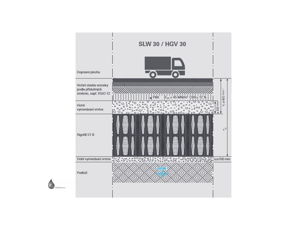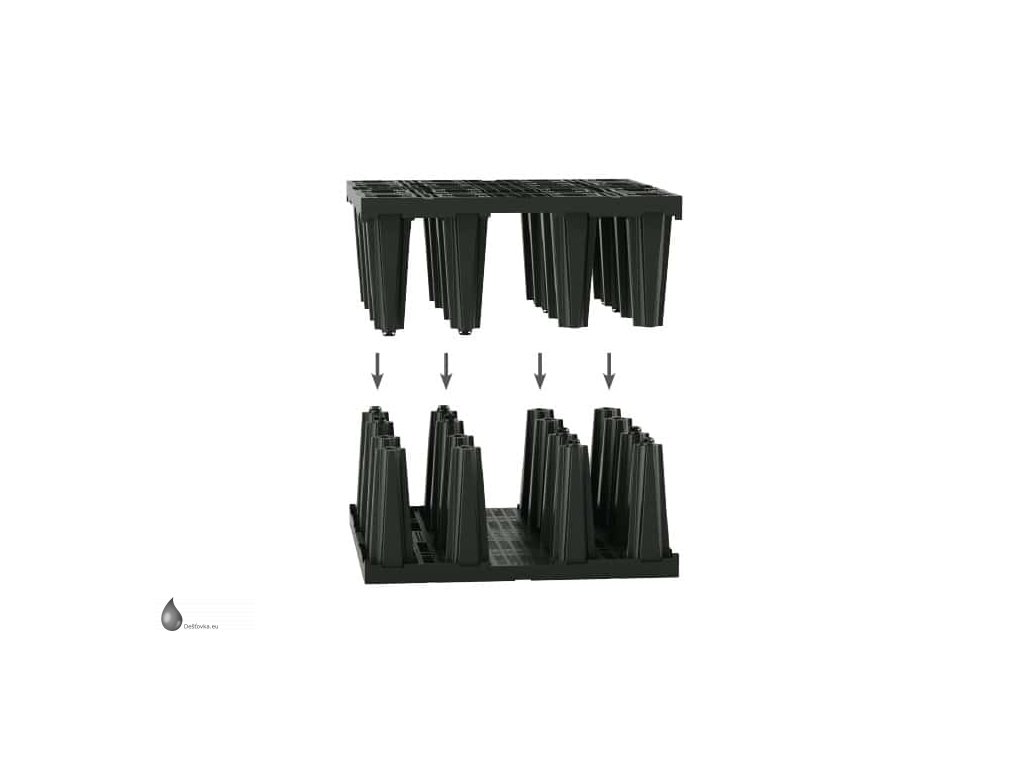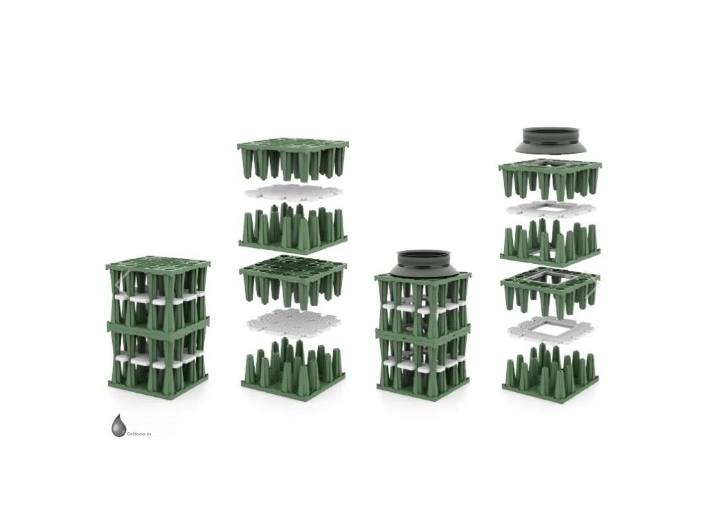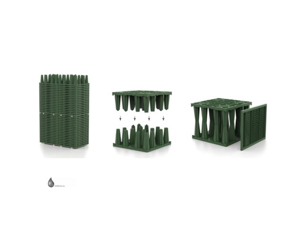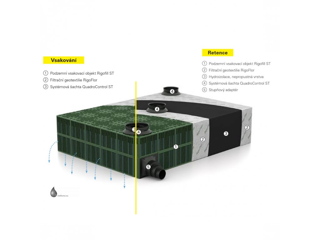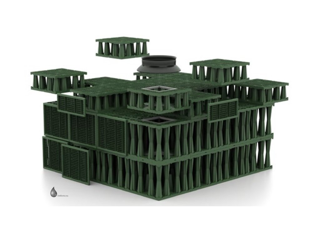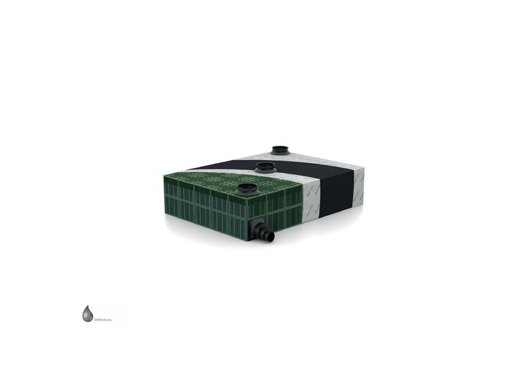 Sada vsakovacích boxů Rigofill ST-B - akumulační objem 2436 l (2,436 m3), včetně bočních mřížek, geotextilie a spojovacích prvků. Rigofill ST jsou plastové bloky určené k zabudování pod zem (podzemní vsakovací objekty) pro shromažďování a vytvoření zásoby vody. Galerie dočasně zachytí dešťovou vodu a s časovým zpožděním ji opět odvádějí dále. Vedle vsakovacích odvodňovacích průlehů a trubních galerií a dříve běžných galerií vyplněných štěrkem se v současnosti ve zvýšené míře budují podzemní vsakovací/retenční objekty.